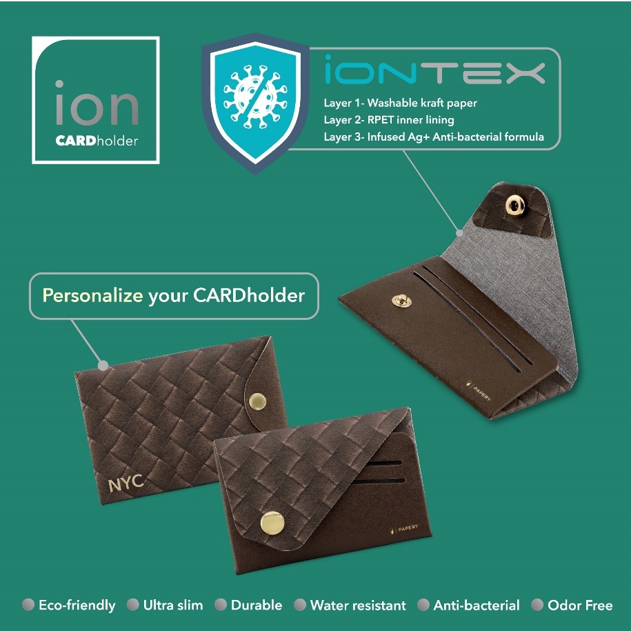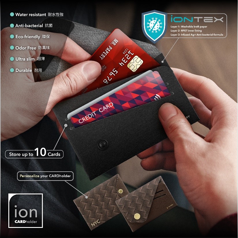 PAPERY is proud to introduce ion-CARDholder, a multi-function accessory that keeps your wallet organised in style. The various layers of ionTEX are armoured with antibacterial function: the eco-friendly washable kraft paper, and the RPET inner fabric infused with antimicrobial SILVADUR™ 930 Flex silver ion. All these materials have met international certification standards in antibacterial, environmental protection and safety (EPA, BPD, OEKO-TEX, Blue sign, and JIS etc). Where style meeting functionality, the ultra slim cardholder can fit up to 10 cards or banknotes, and can kill germs on them in no time. You could also personalise your ion-CARDholder by making use of our “Create your own” service.
